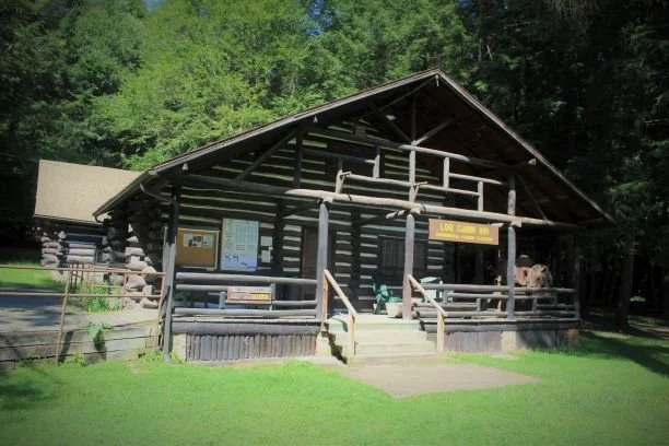 The trail into the Forest Cathedral area starts just behind the Log Cabin Inn environmental center (photo left) which is located 1 mile up Forest Road from Rt 36. There is ample parking at the center and we will meet at the Log Cabin.