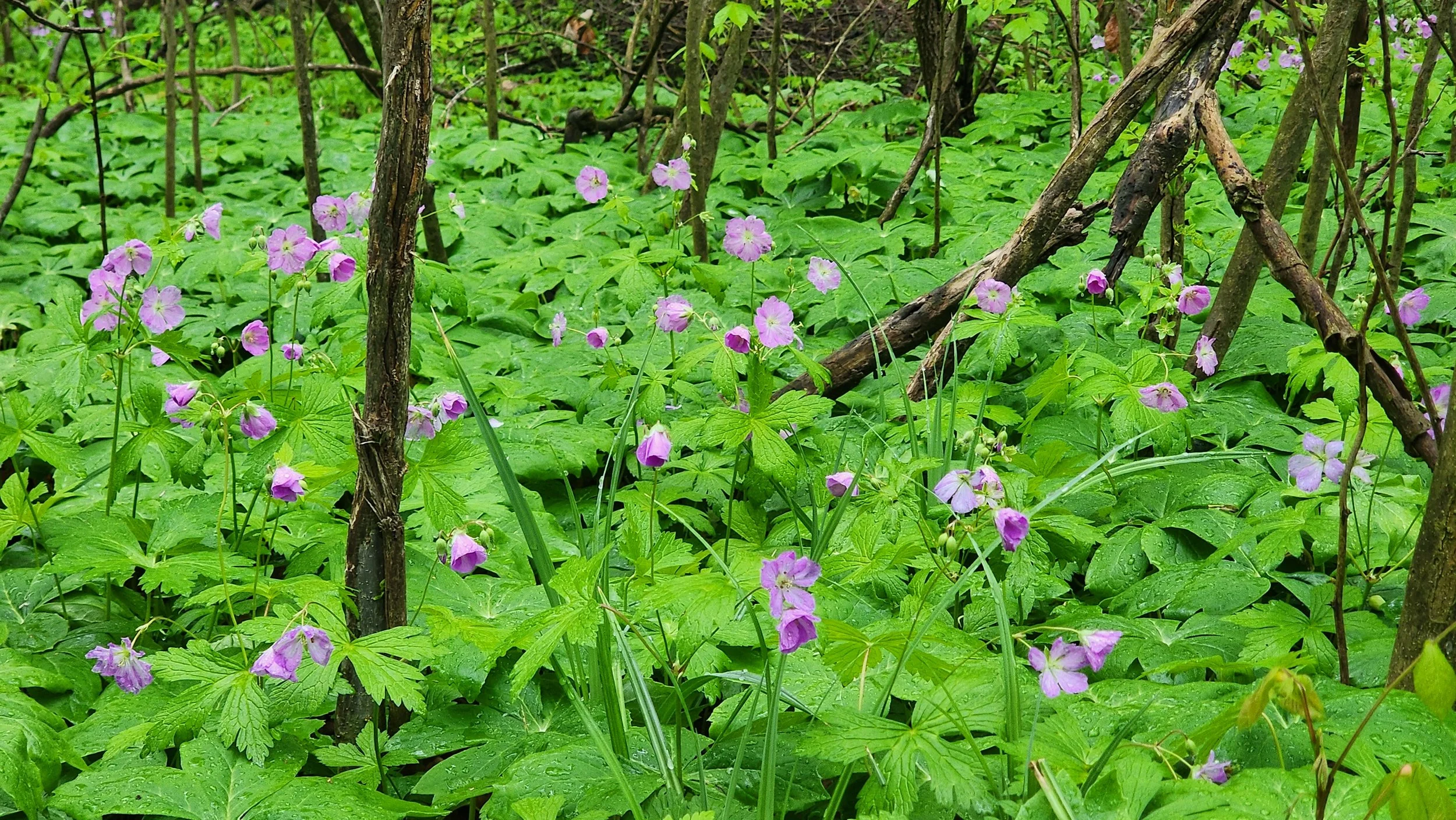 The swamp at Pearson Metropark is defined by towering, wide-spreading old-growth trees, a dense understory of spicebush, and a spring forest floor alive with wildflowers such as wild ginger and jack-in-the-pulpit.